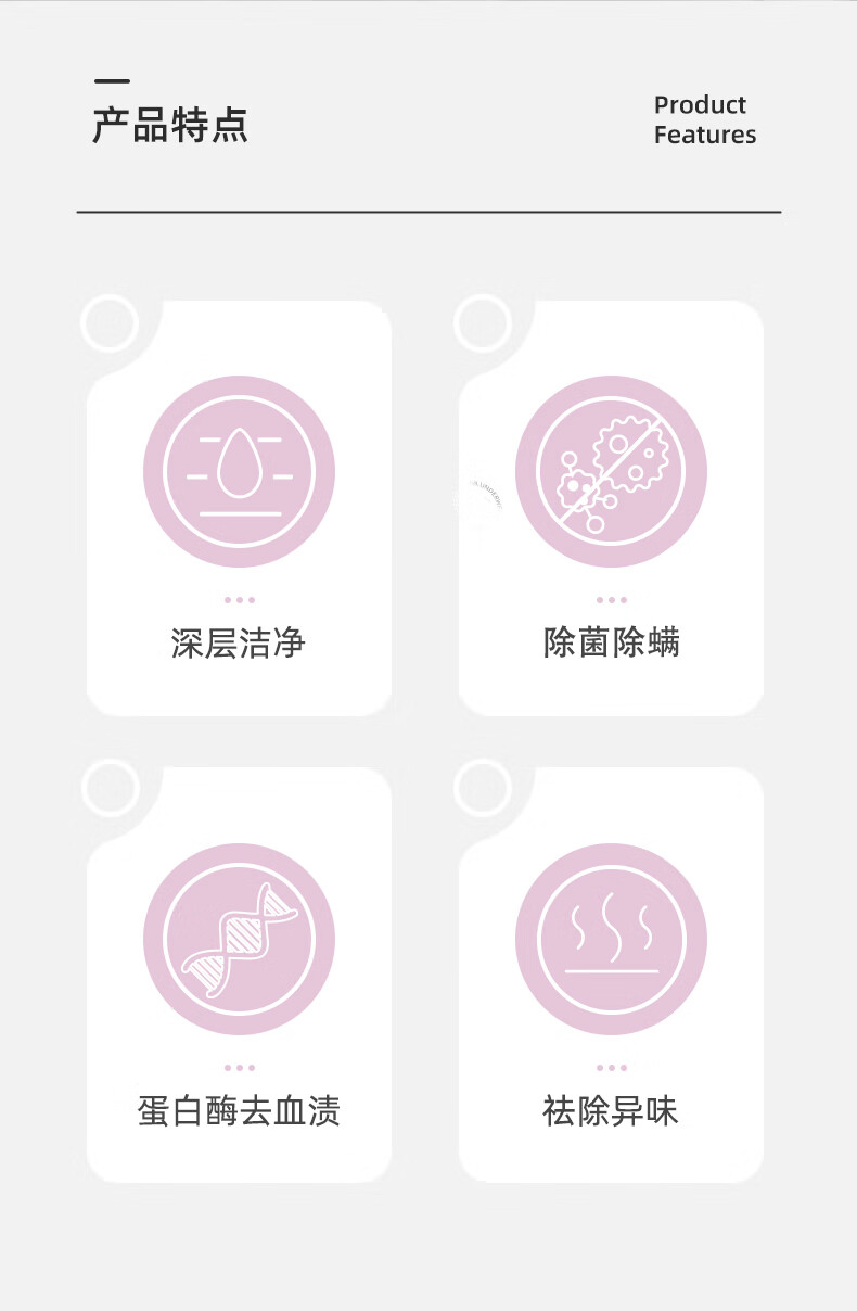 主要成分:表面活性劑、氨基酸表面活性劑、棕櫚仁油表面活性劑、助劑、除螨劑、酶劑等