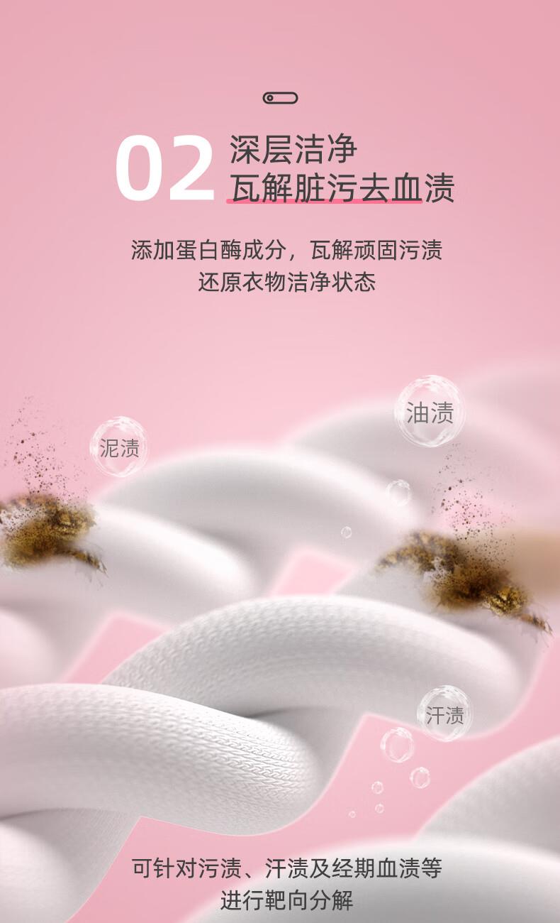 5、添加蛋白酶成分,瓦解頑固污漬及經(jīng)期血漬等,還原衣物清潔狀態(tài)