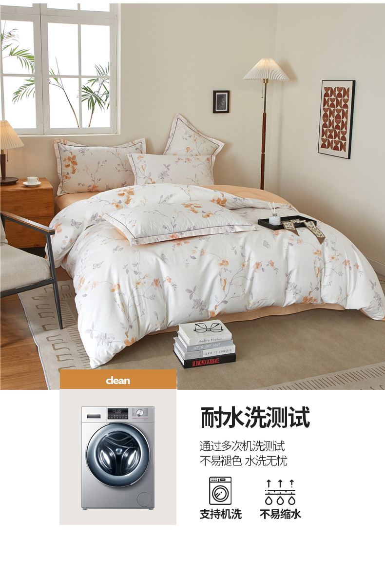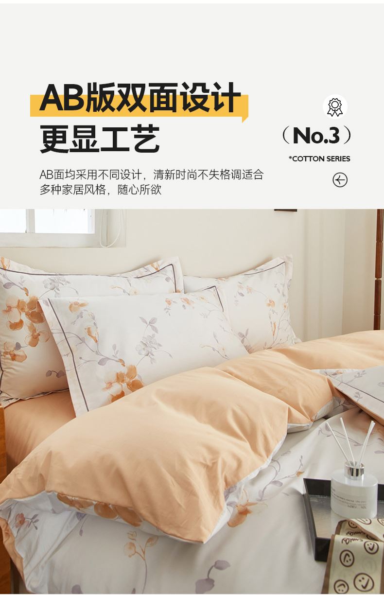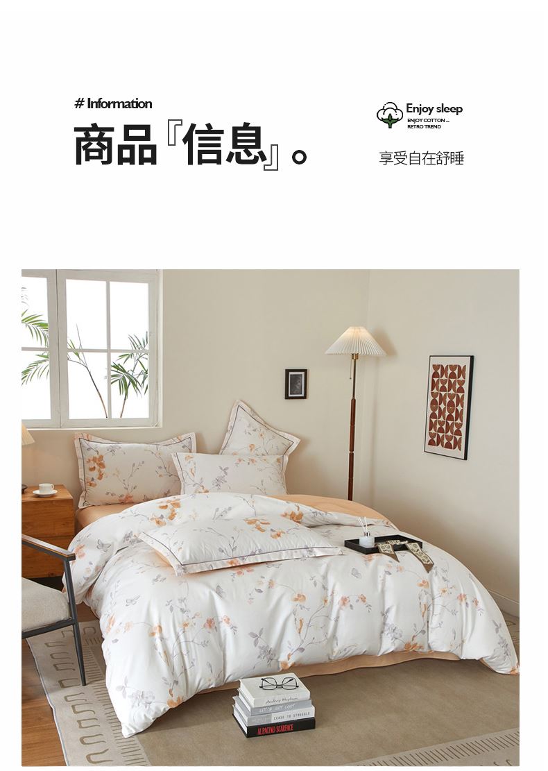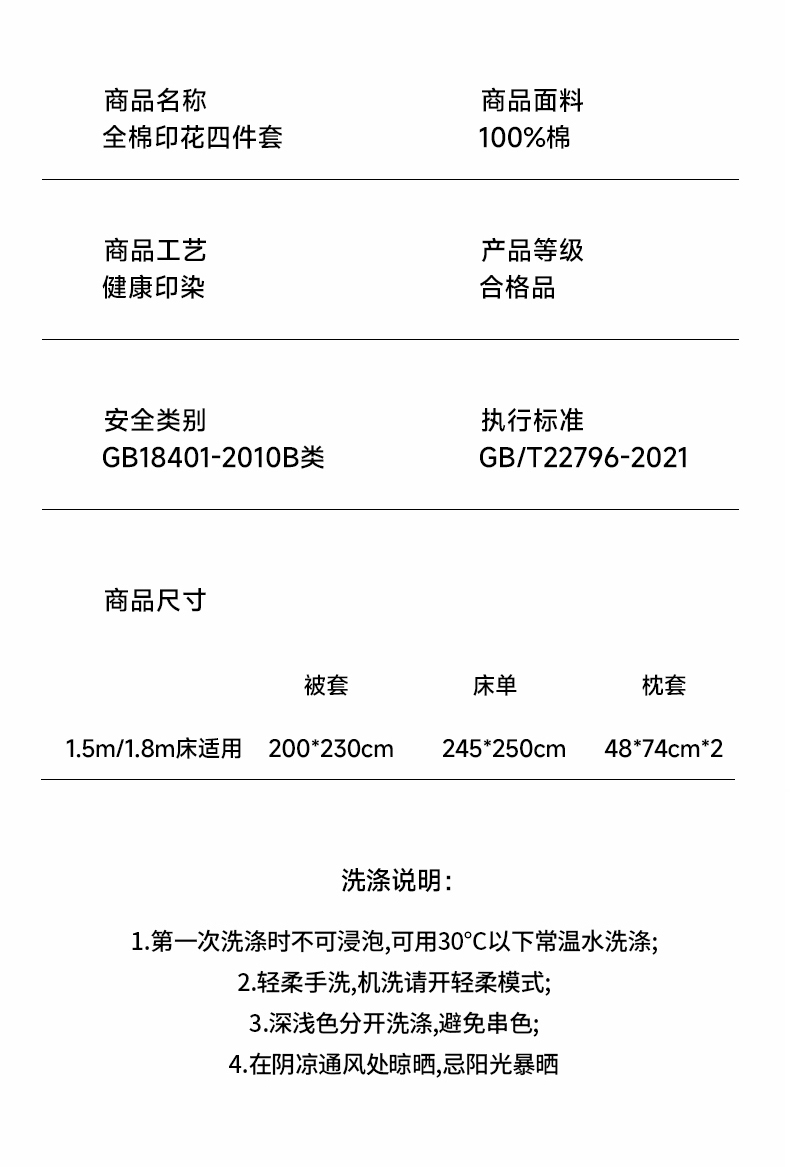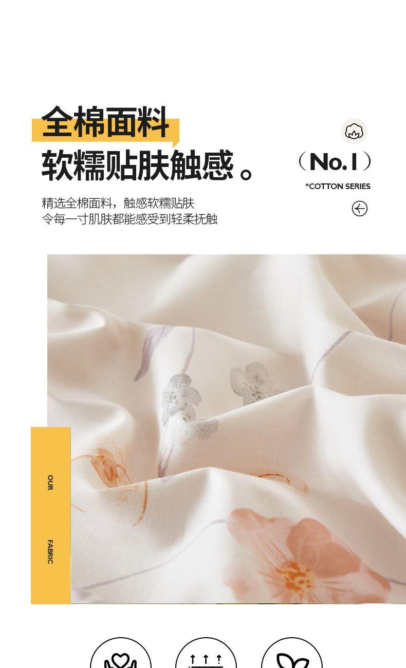 被套:200×230cm 床單:245×250cm 枕套:48×74cm 面料:棉(133×76精梳棉) 適用:1.5m-1.8m床 印染工藝:活性印花 風(fēng)格:輕奢田園風(fēng) 優(yōu)選全棉高密度織造面料,AB版雙面設(shè)計,活性印染工藝,清新時尚不失格調(diào)適合多種家居風(fēng)格,隨心所欲。
