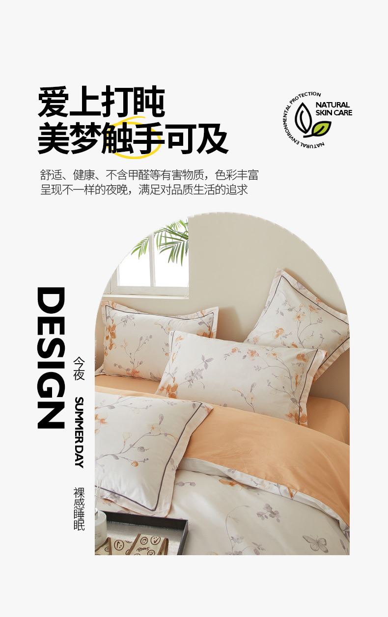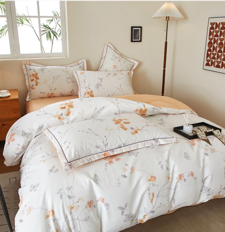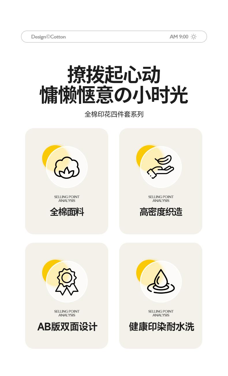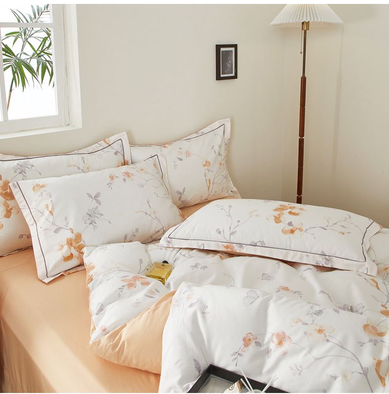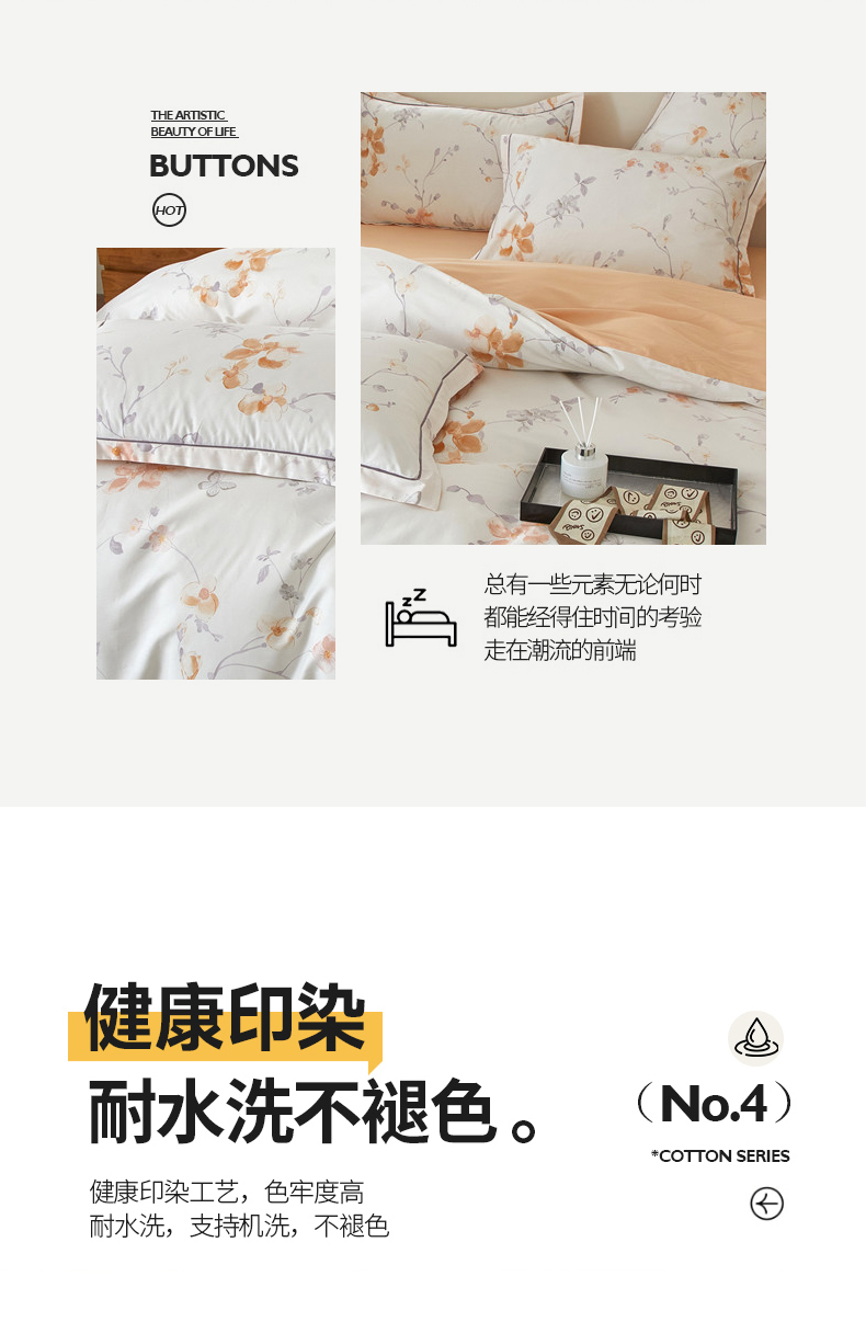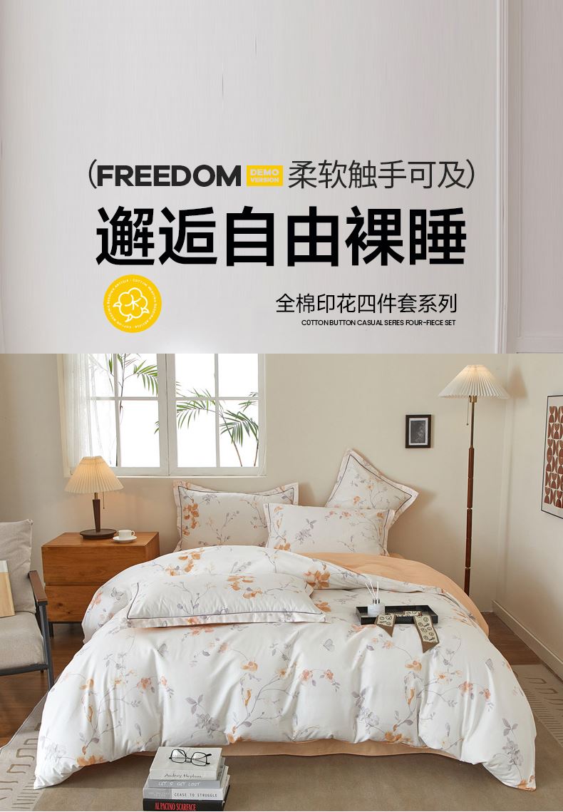被套:200×230cm 床單:245×250cm 枕套:48×74cm 面料:棉(133×76精梳棉) 適用:1.5m-1.8m床 印染工藝:活性印花 風(fēng)格:輕奢田園風(fēng) 優(yōu)選全棉高密度織造面料,AB版雙面設(shè)計,活性印染工藝,清新時尚不失格調(diào)適合多種家居風(fēng)格,隨心所欲。