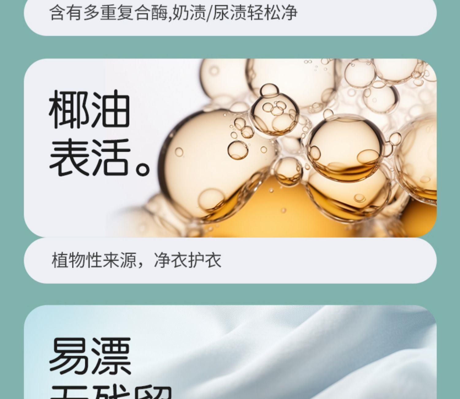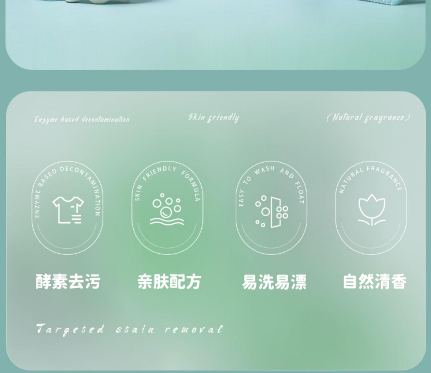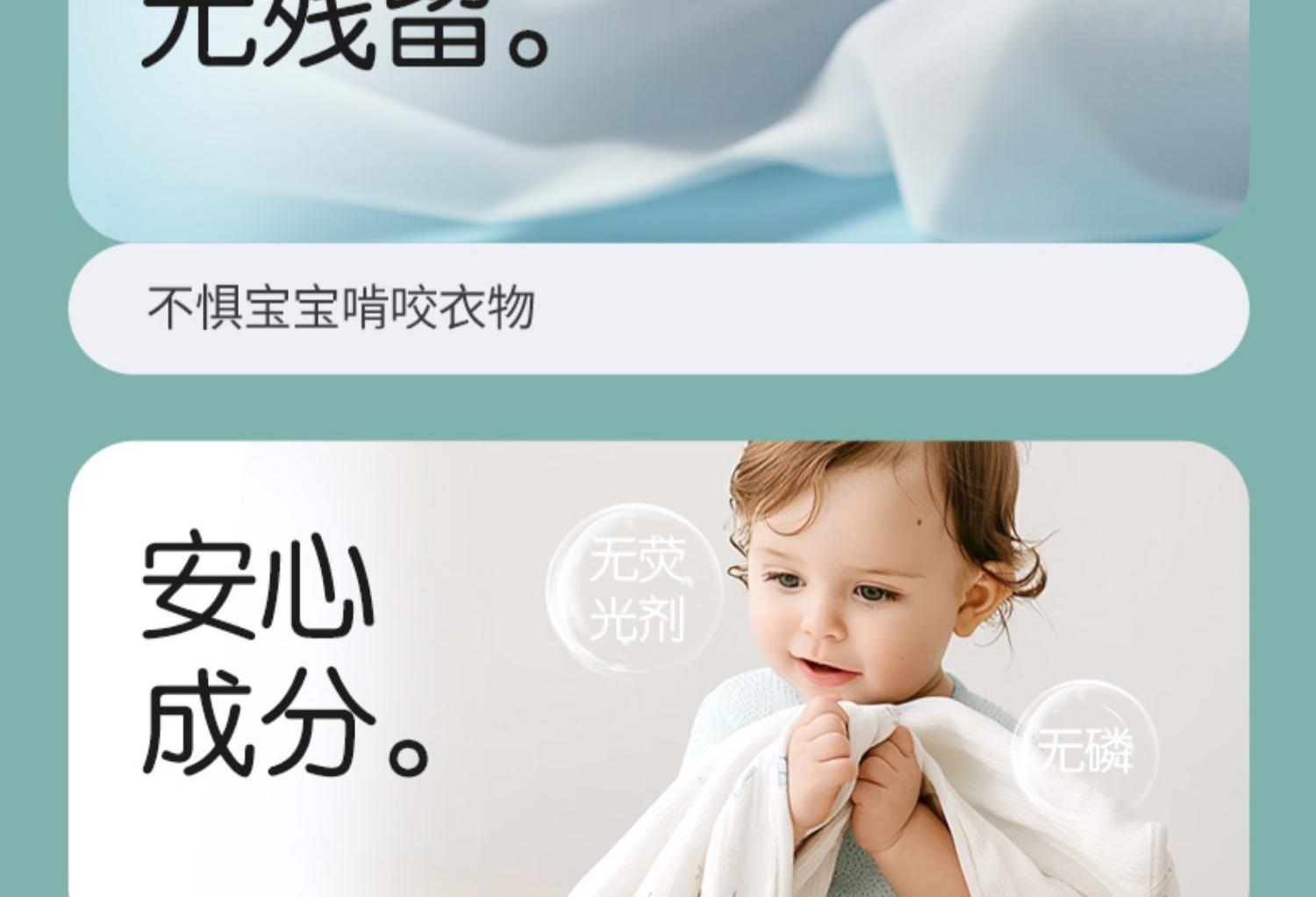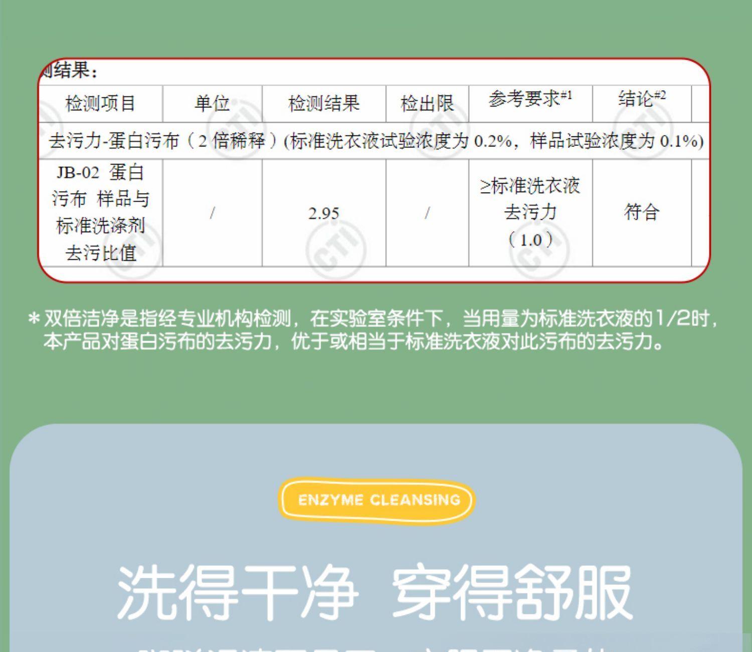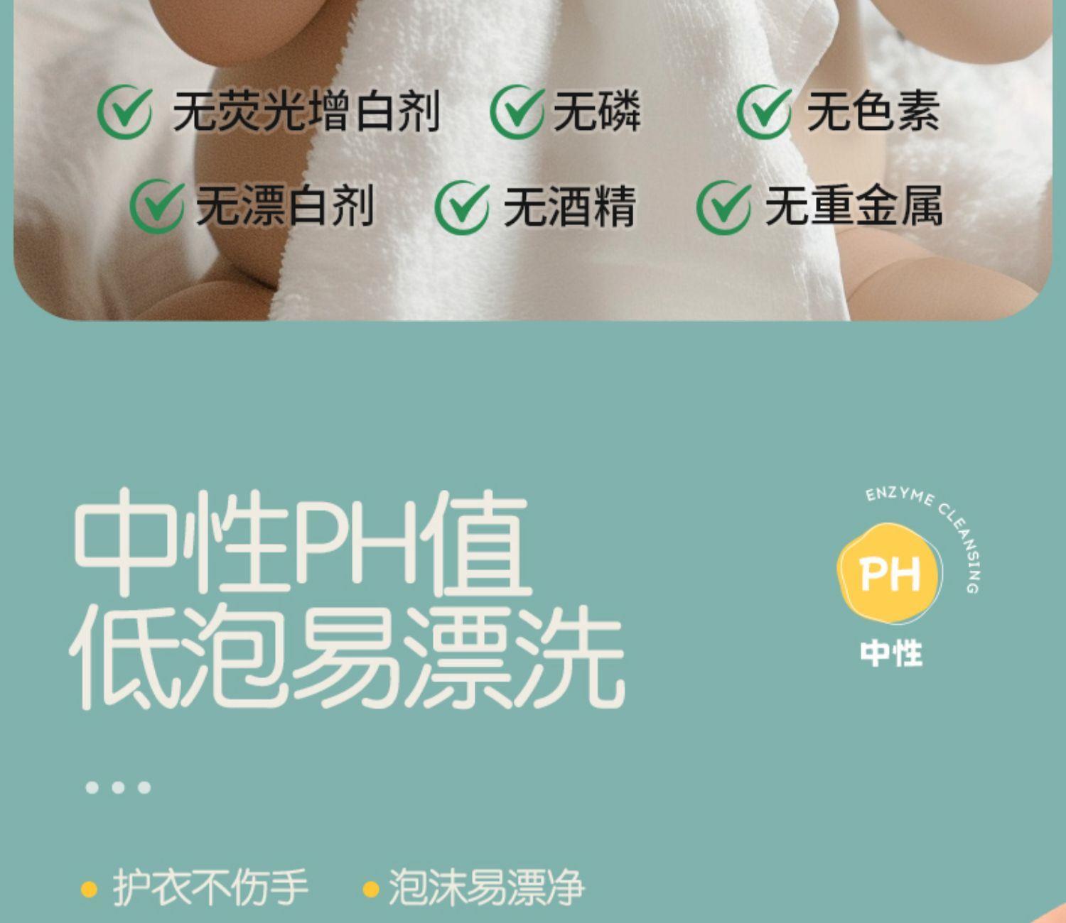 銷售規(guī)格:1kg/瓶*1瓶 主要成分:水、表面活性劑、椰子油衍生物、蛋白酶、脂肪酶、纖維素酶等保質(zhì)期:3年 1、含有多重復(fù)合酶,奶漬/尿漬輕松洗凈; 2、植物萃取精華,植物活性成分,全新呵護(hù)寶寶肌膚; 3、中性PH值,低泡易漂洗,護(hù)衣不傷手; 4 、安心植物香氛,洗除衣服異味,自然清香; 5、不添加熒光增白劑、無磷配方使用更放心。