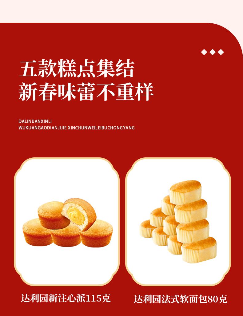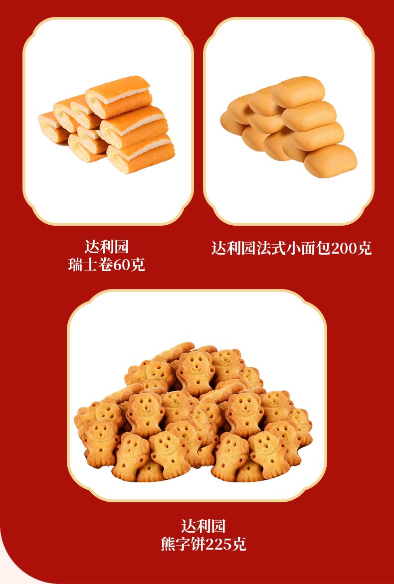 達(dá)利園熊字餅 225克 達(dá)利園法式小面包 200克 達(dá)利園法式軟面包 80克 達(dá)利園新注心派 115克 達(dá)利園瑞士卷 60克