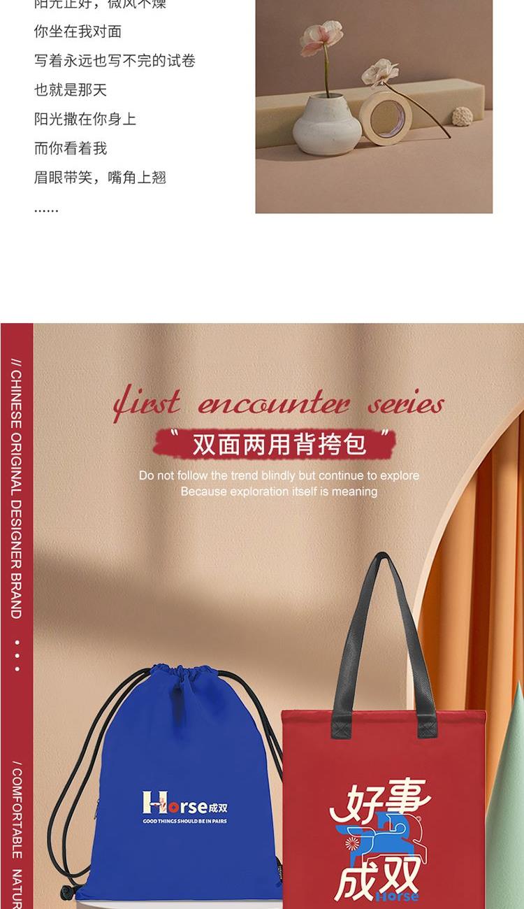采用創(chuàng)意兩面設(shè)計,同一款包帶給你兩種不同體驗;肩帶和抽繩背袋的雙重設(shè)計,滿足單肩挎和雙肩背的使用方式。單肩/雙肩,一秒切換,應(yīng)對全場景出行。