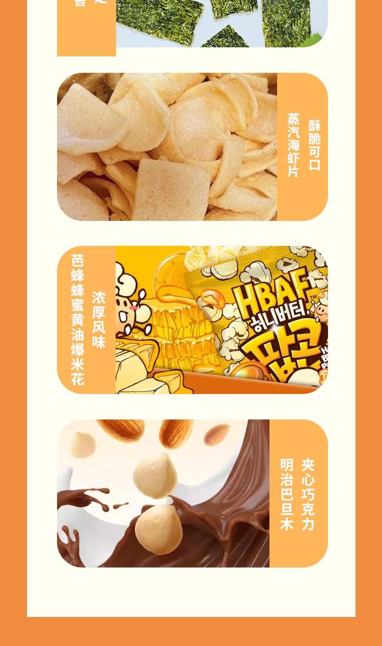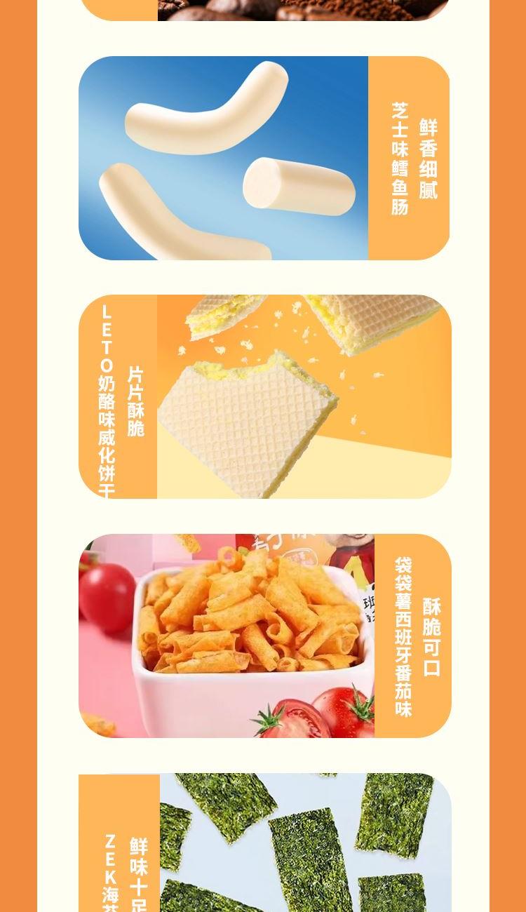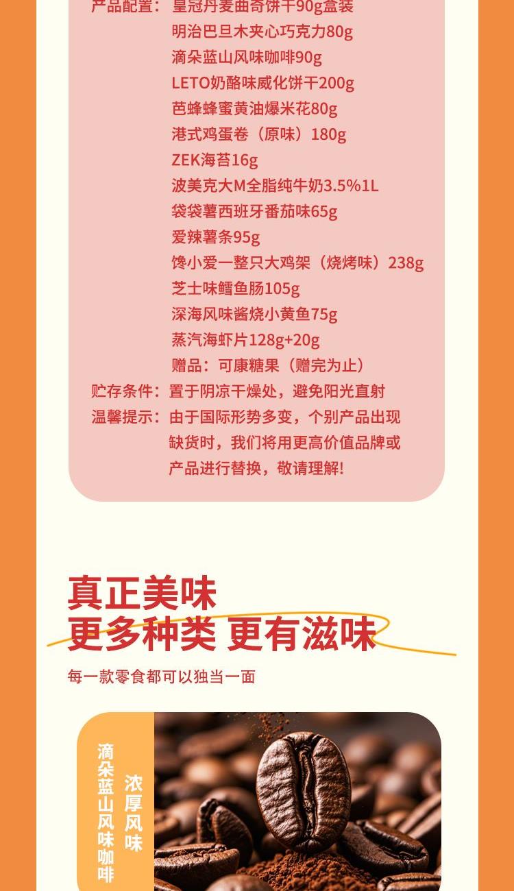 配置: 皇冠丹麥曲奇餅干90g盒裝 明治巴旦木夾心巧克力80g 滴朵藍山風(fēng)味咖啡90g LETO奶酪味威化餅干200g 芭蜂蜂蜜黃油爆米花80g 港式雞蛋卷(原味)180g ZEK海苔16g 波美克大M全脂純牛奶3.5%1L 袋袋薯西班牙番茄味65g 愛辣薯條95g 饞小愛一整只大雞架(燒烤味)238g 芝士味鱈魚腸105g 深海風(fēng)味醬燒小黃魚75g 蒸汽海蝦片128g+20g 贈品:可康糖果