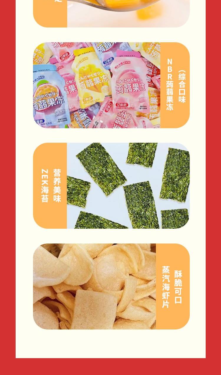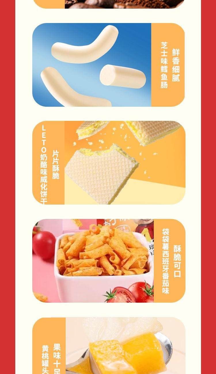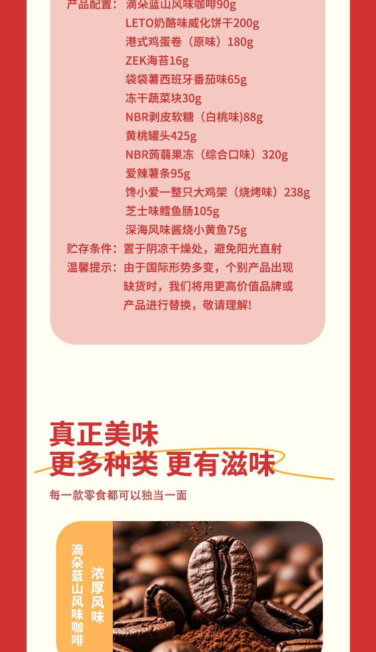 配置: 滴朵藍(lán)山風(fēng)味咖啡90g LETO奶酪味威化餅干200g 港式雞蛋卷(原味)180g ZEK海苔16g 袋袋薯西班牙番茄味65g 凍干蔬菜塊30g NBR剝皮軟糖(白桃味)88g 黃桃罐頭425g NBR蒟蒻果凍(綜合口味)320g 愛(ài)辣薯?xiàng)l95g 饞小愛(ài)一整只大雞架(燒烤味)238g 芝士味鱈魚(yú)腸105g 深海風(fēng)味醬燒小黃魚(yú)75g