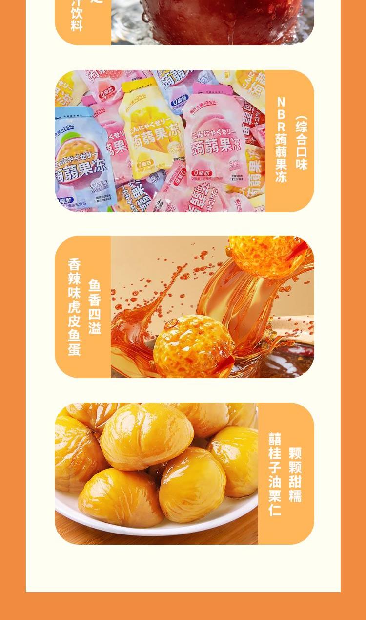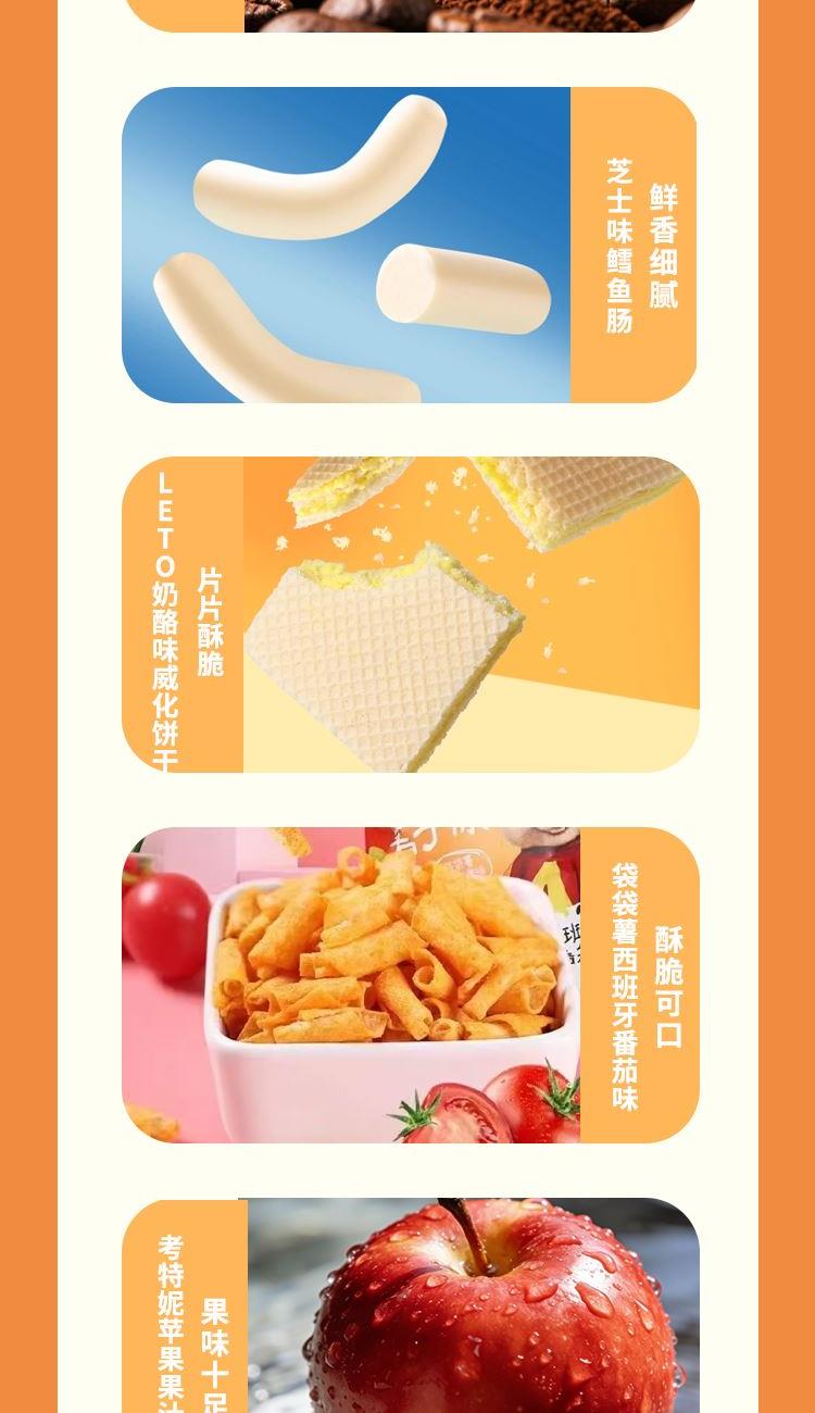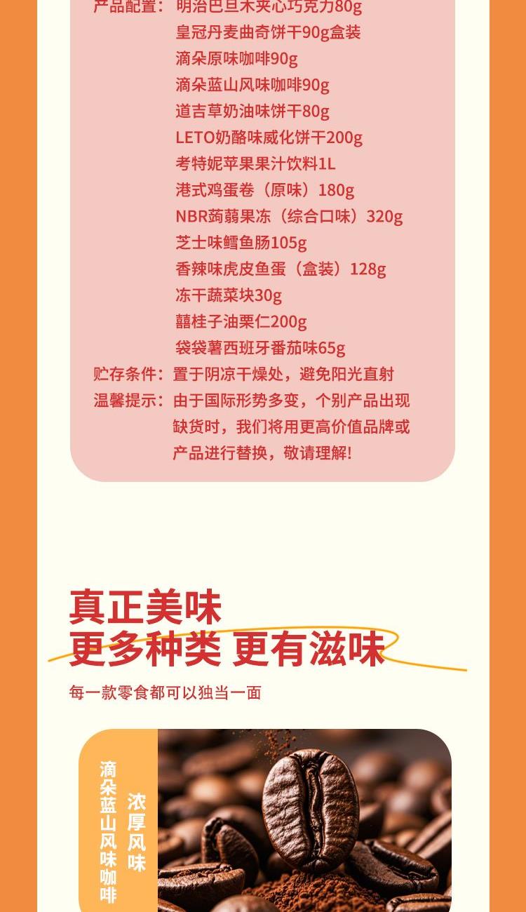 配置: 明治巴旦木夾心巧克力80g 皇冠丹麥曲奇餅干90g盒裝 滴朵原味咖啡90g 滴朵藍(lán)山風(fēng)味咖啡90g 道吉草奶油味餅干80g LETO奶酪味威化餅干200g 考特妮蘋(píng)果果汁飲料1L 港式雞蛋卷(原味)180g NBR蒟蒻果凍(綜合口味)320g 芝士味鱈魚(yú)腸105g 香辣味虎皮魚(yú)蛋(盒裝)128g 凍干蔬菜塊30g 囍桂子油栗仁200g 袋袋薯西班牙番茄味65g