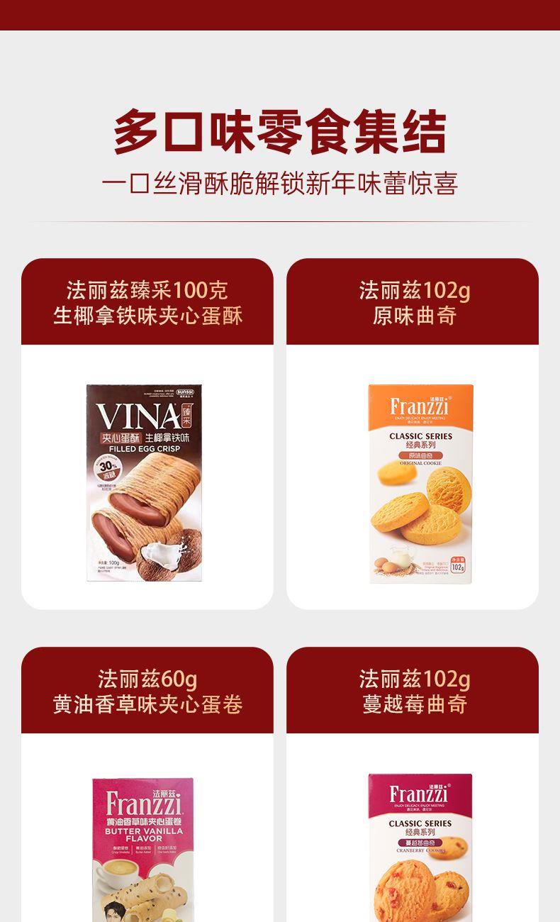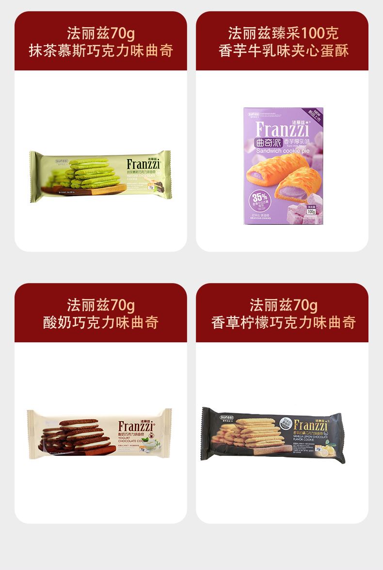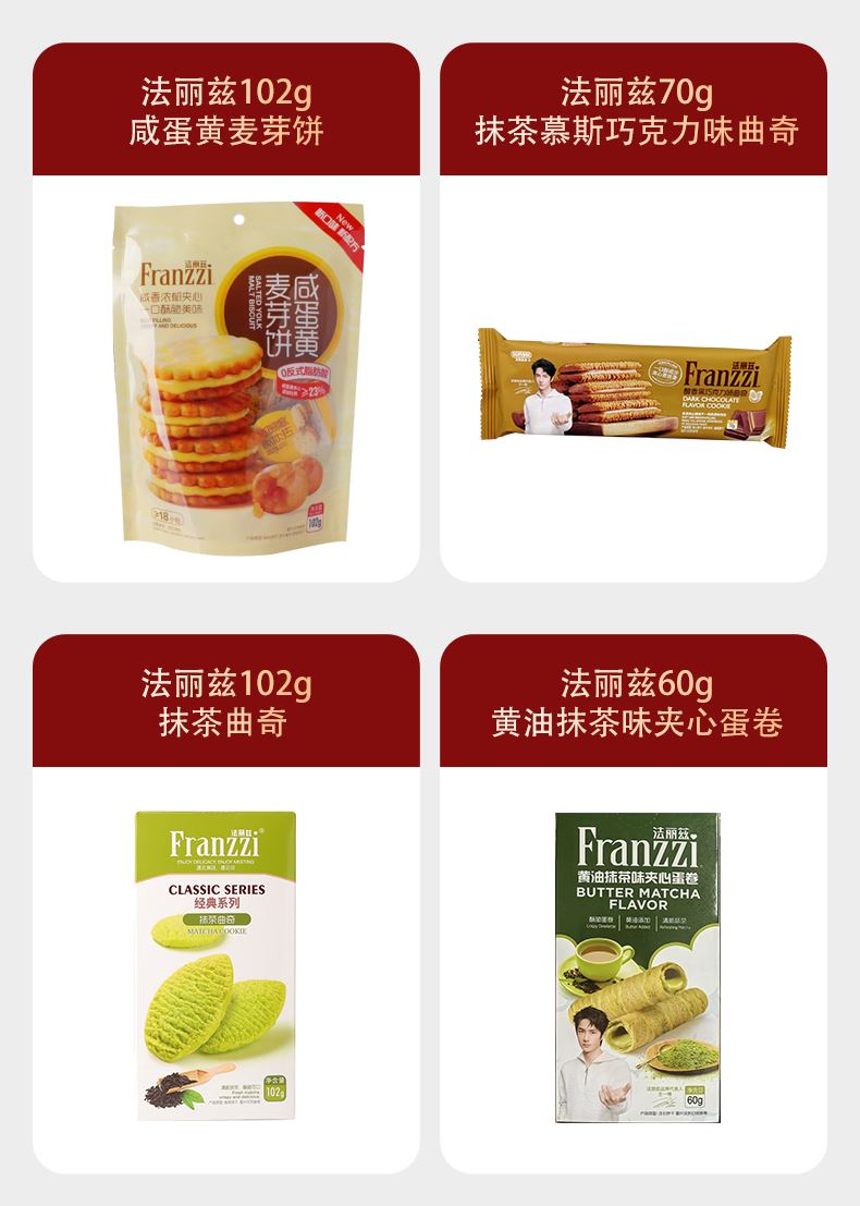 醇香黑巧克力味曲奇 70克 香草檸檬巧克力味曲奇 70克 抹茶慕斯巧克力味曲奇 70克 酸奶巧克力味曲奇 70克 原味曲奇 102克 抹茶曲奇 102克 蔓越莓曲奇 102克 黃油抹茶味夾心蛋卷 60克 黃油香草味夾心蛋卷 60克 生椰拿鐵味夾心蛋酥 100克 香芋牛乳味夾心蛋酥 100克 咸蛋黃麥芽餅 102克