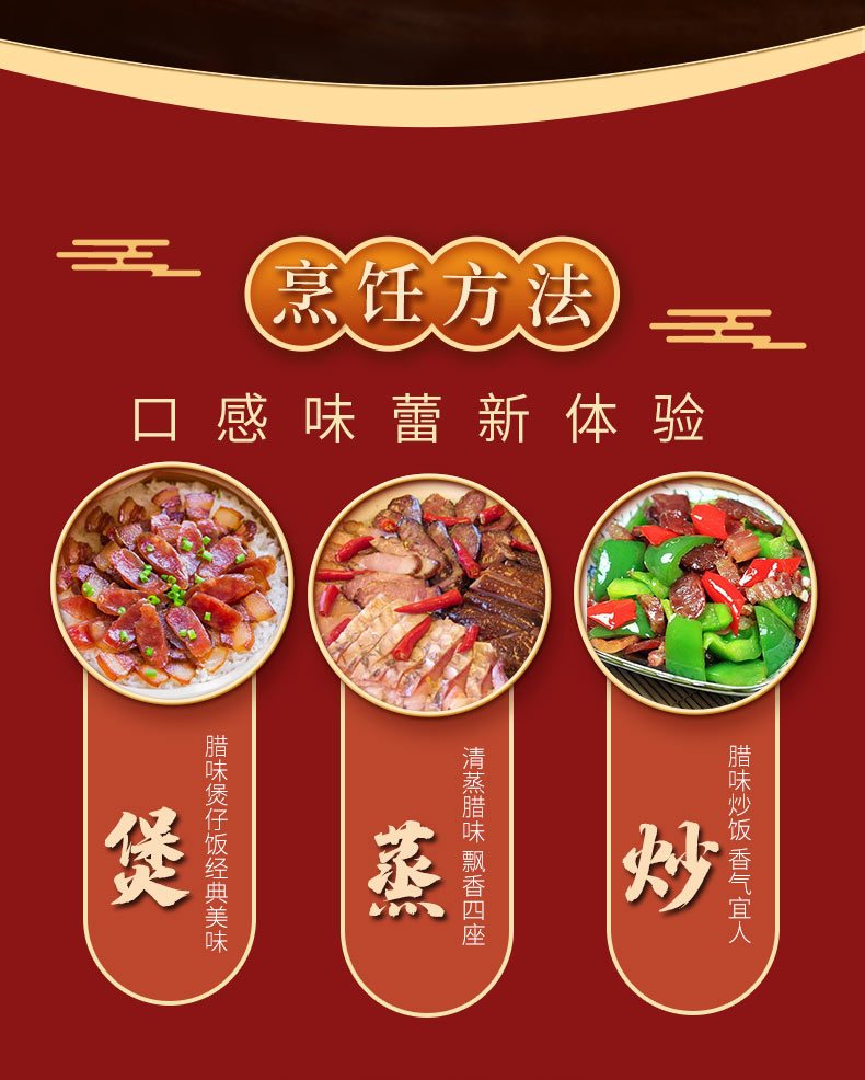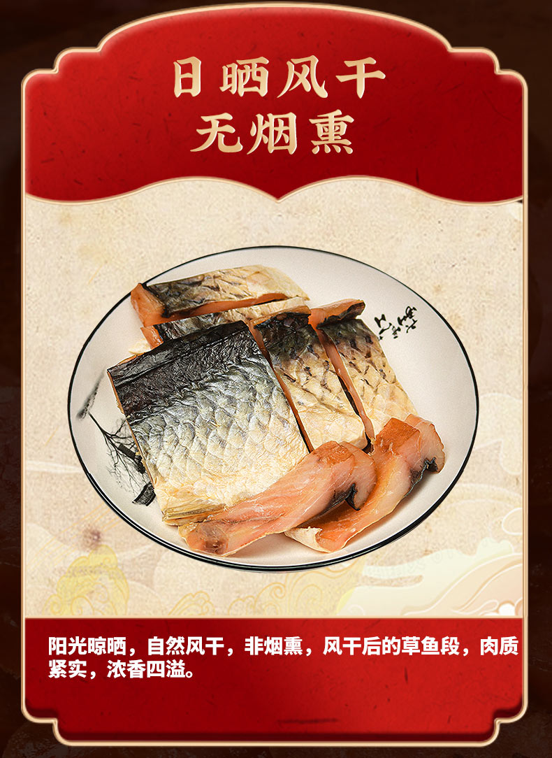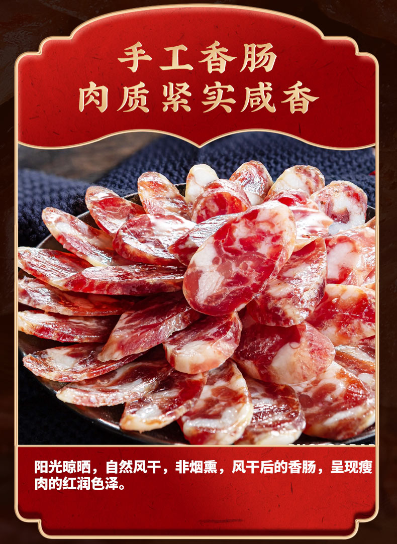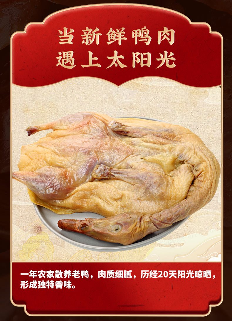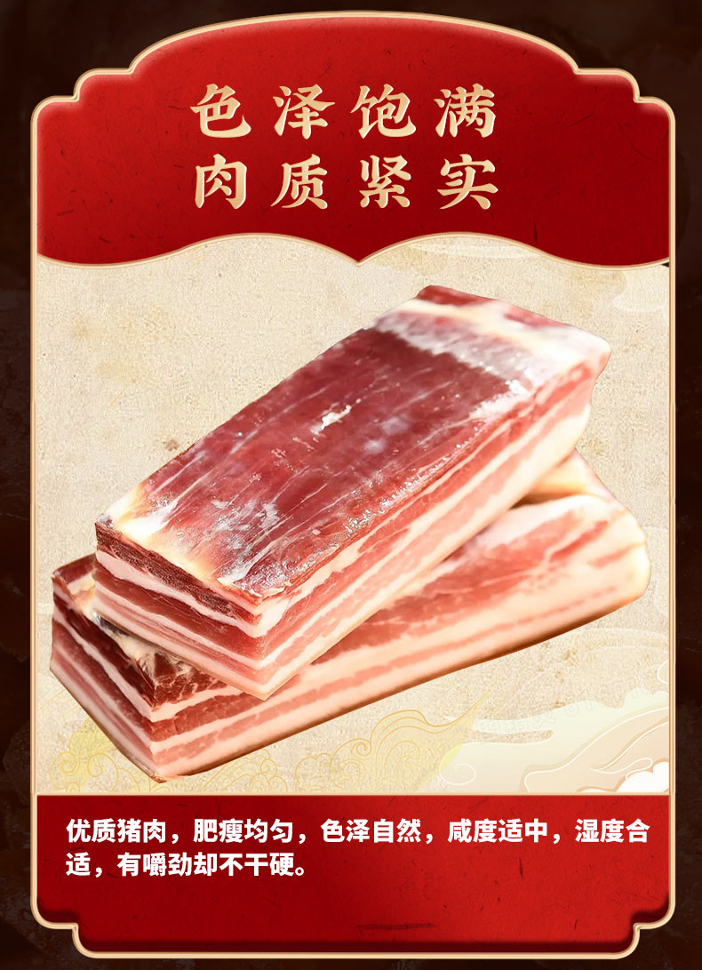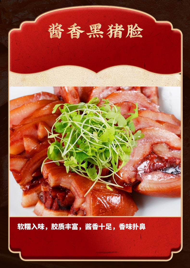 風干板鴨 600克 農(nóng)家風干雞 850克 純?nèi)馐止は隳c 200克 徽州刀板香 200克 草魚段 400克 醬香黑豬臉 200克