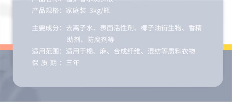 銷售規(guī)格:3kg/瓶*1瓶 外包裝方式:紙箱包裝 主要成分:去離子水、表面活性劑、椰子油衍生物、香精助劑、防腐劑等 保質期:3年 1.除螨,去漬柔護; 2.低泡易漂,省心潔凈; 3.無磷配方,全家適用; 4.添加活性因子,潔凈出彩; 5.瑞士進口香氛,散發(fā)優(yōu)雅奢香; 6.微膠囊留香技術,香味綿長持久。